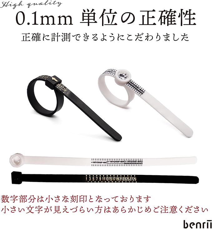 【素材と耐久性】benrii リングゲージバンドはプラスチック製で軽量ながら、耐久性にも優れています。繰り返し使用できるため、長期間にわたって利用可能です。