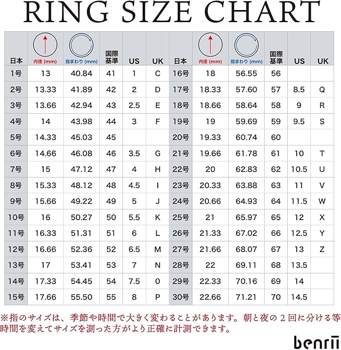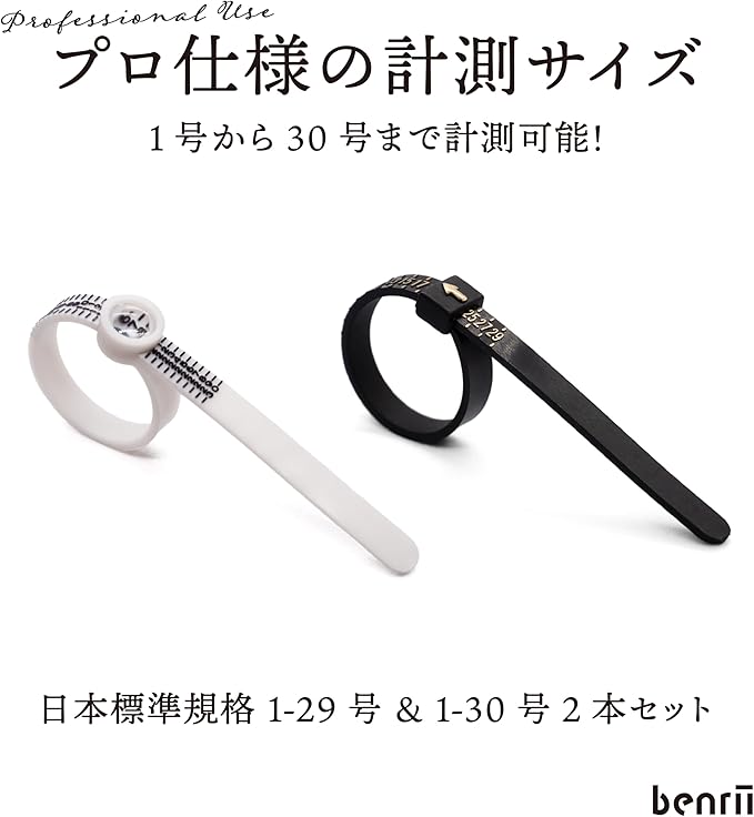 【簡単に測れる】指に巻き付けてサイズを調整するだけの簡単操作で、初めての方でも安心して使用できます。 【商品詳細】1~29号リングゲージバンド1本、1~30号ルーペ付きリングゲージバンド1本 の計2本セットです。 【素材と耐久性】benrii リングゲージバンドはプラスチック製で軽量ながら、耐久性にも優れています。繰り返し使用できるため、長期間にわたって利用可能です。 【衛生的】benrii リングゲージバンドは洗浄が可能な素材を使用しているため、清潔に保つことができます。 【安心の国内企業】benriiは安心安全の国内企業。1年間の保証付き!