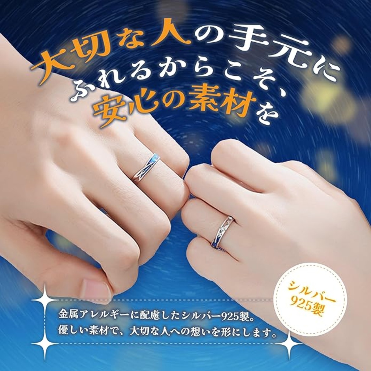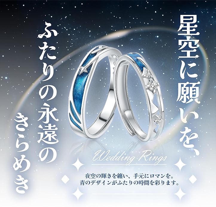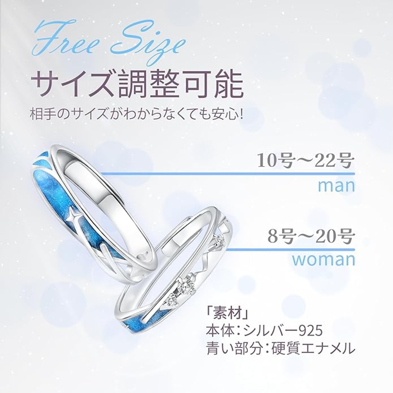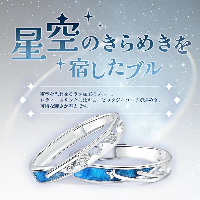 【ユニークなデザイン】流れ星をイメージした愛の願いを叶えてくれるペアリングです。夜空を駆け抜ける流れ星がその まま指に落ちているようなファンタジーな雰囲気を演出してくれます。さらにブルーのエナメルが手元を綺麗に彩り、普 段使いはもちろん、華やかな装いにも相応しいアイテムです