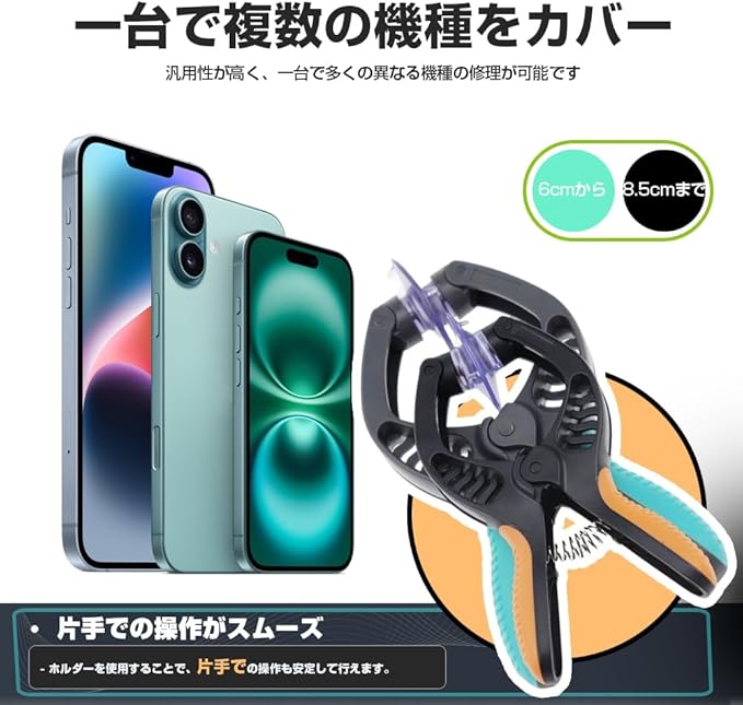 スマートフォン修理の必需品iPhoneやiPad、Samsung Galaxy、Xperiaなど、さまざまな携帯電話に対応した工具です。簡単4手順で分解・修理が可能で、修理作業を効率化します。
