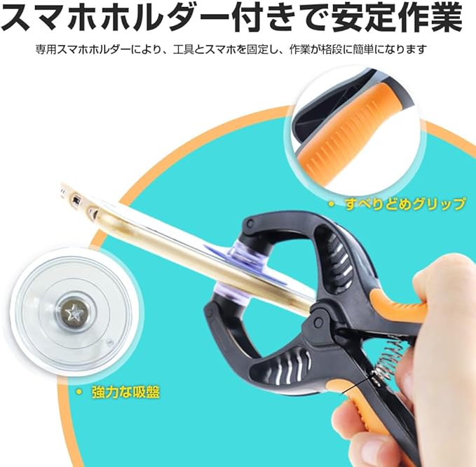 2. スマホホルダー付きで作業性向上専用スマホホルダー付きで、工具とスマホを安定して固定でき、作業が格段に簡単になります。片手での操作もスムーズに行えます。