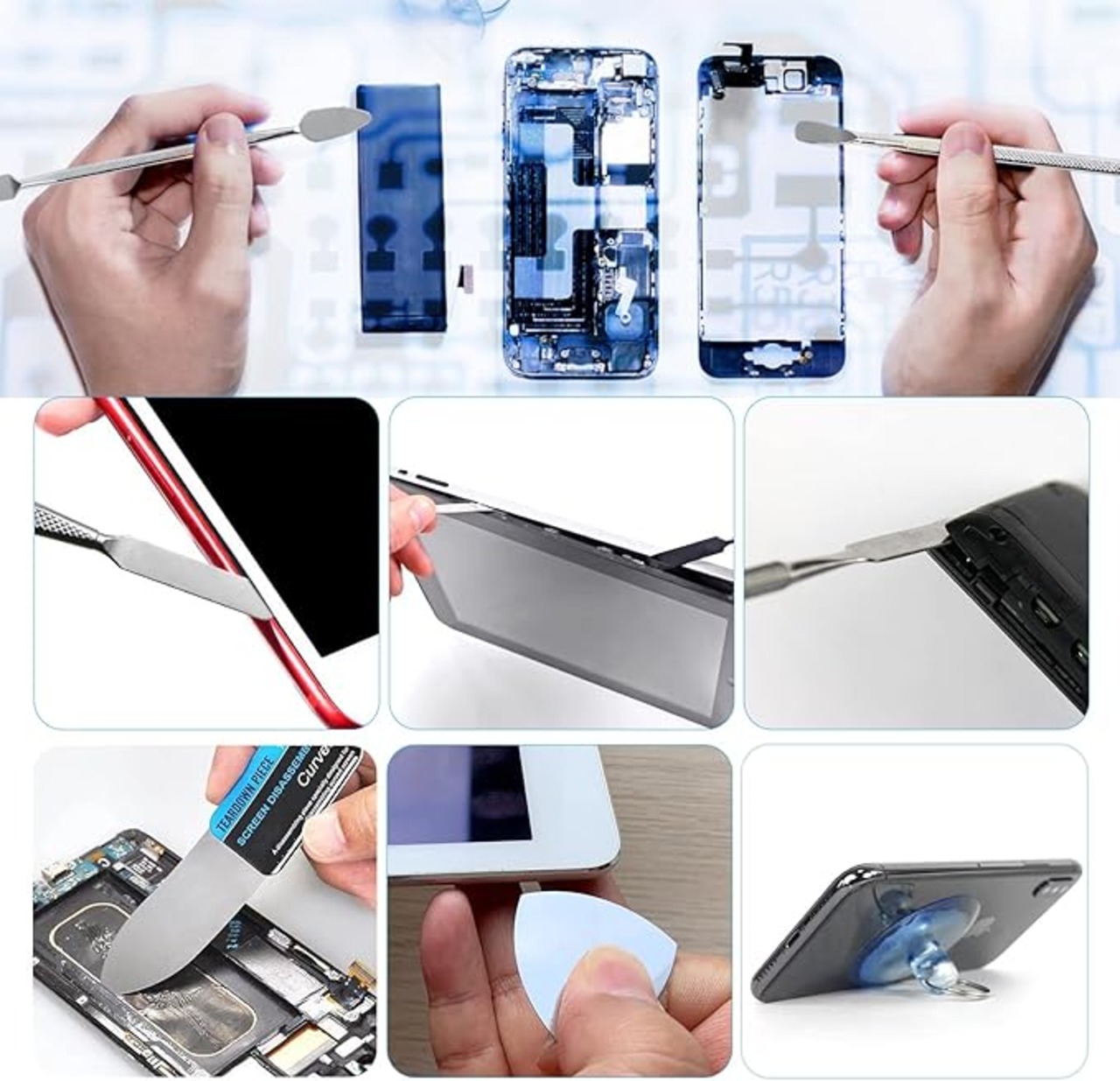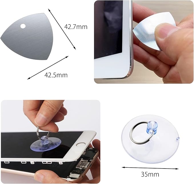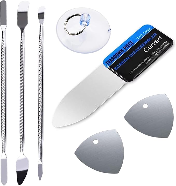 【商品仕様】薄い0.1mmスパッジャー 1、スパッジャー 2、金属ヘラ 3、吸盤オープナー 1。様々な分解をこれ1つの工具セットで解決できます。