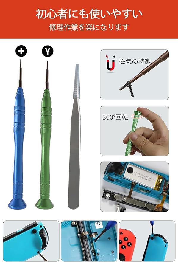 【改良されたドライバー・耐久性優れた】Yネジとは、ニンテンドースイッチのコントローラを分解する際に、一番最初に取り外す4本のネジのことです、「Y型」の溝になっています。それに、内部のネジを取り外すために、+型のドライバーが必要です。ドライバーの先端に磁気が搭載されますので、Joyconのネジを外す際に使用する時、バッチヘッド磁気でネジを落とさなくない超楽です。予備のネジ6pcsが付属し、ネジが壊れたり、紛失したりする時、予備のネジを交換できます。また、市場のプラスチック製のドライバーの代わりにアルミ合金を使用して、耐久性や耐磨耗性に優れています。