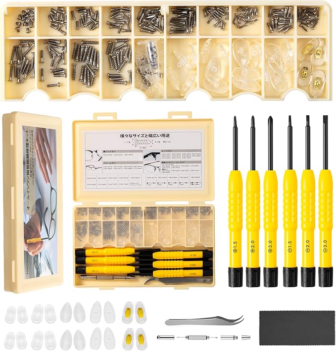 【コンパクト収納のプロ用修理キット】磁気付きプラス/マイナスドライバー各3本、極小ネジ14サイズ、シリコン鼻パッド10組(5サイズ)、精密ピンセット・マイクロドライバー・ワッシャー等、必要な工具/パーツをミニケースに完全収納。自宅で眼鏡店レベルの修理が可能に。