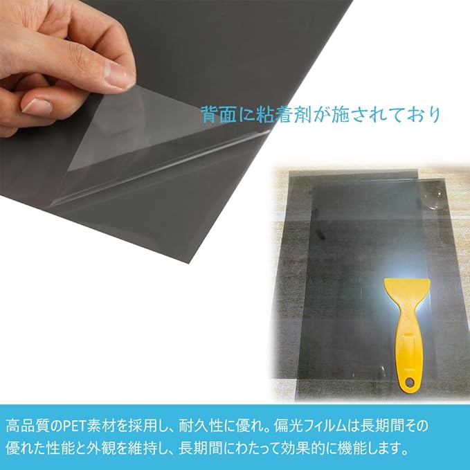 【簡単に貼り付け】背面に粘着剤が施されており、フィルムの取り付けが簡単で、痕跡や気泡を残さず、スクリーンにしっかりと密着します。パッケージ内容:偏光フィルムシート2枚、スクレーパー1枚。