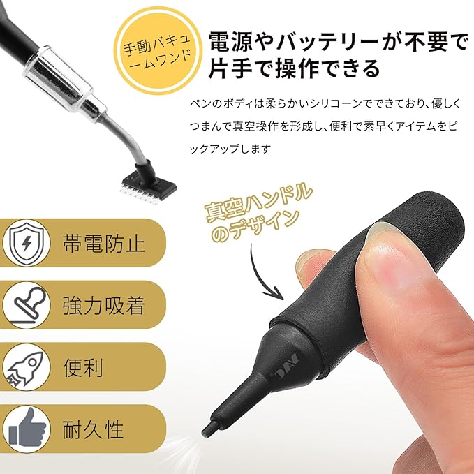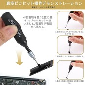 【基本構成】高精度真空吸引ペン(本体長90mm)と4サイズの交換用吸着カップ、の実用的なセット。