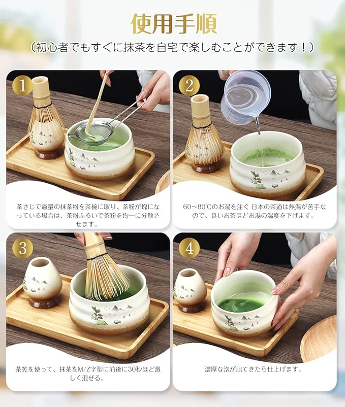 【操作簡単】これは、お茶の内側のまろやかを引き出し、泡状の泡の中に抹茶パウダーを泡立てするのに役立ちます。気軽に抹茶を始めたい!これだけあれば届いたその日からお抹茶が楽しめるセットです。