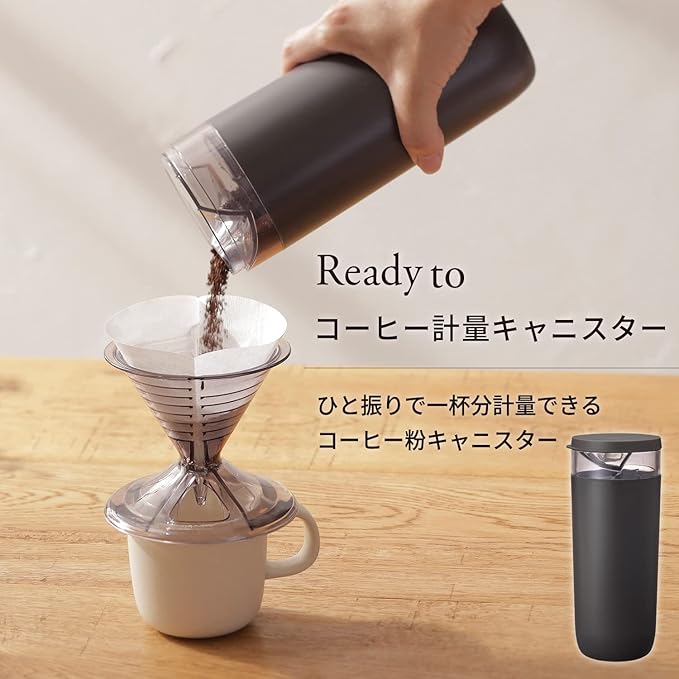 【ひと振りで一杯分計量】計量スプーンや、はかり不要。一杯分が量れるコーヒー粉キャニスターです。ハンドドリップの競技会に審査・運営で10年以上携わっているコーヒーのエキスパートと共同開発しました。