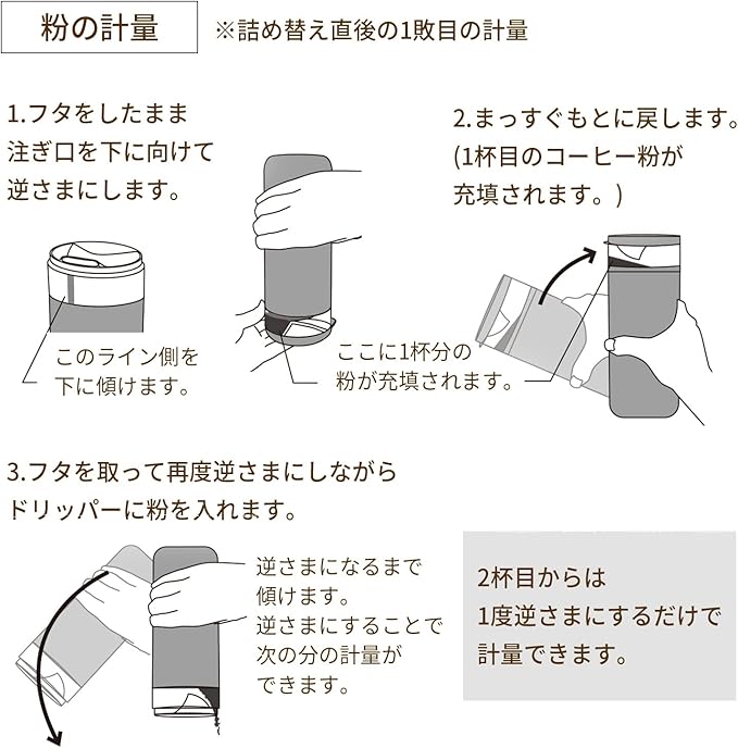 【使い方】さかさまにすることで1杯分が溜まって、向きを元に戻すと、注ぎ口の下のスペースに1杯分が移動します。1杯目はフタをしたまま計量し、2杯目以降はドリッパーに注ぐ際に次の分の計量ができる仕組みです。