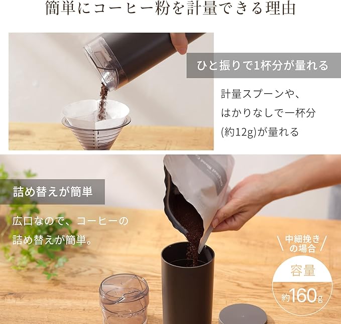 【詰め替え簡単】広口なので、コーヒーの詰め替えが簡単です。中細挽きの場合、容量約160gです。
